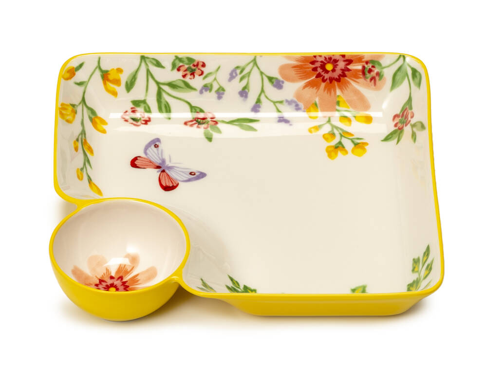 Un piatto da portata sui generi, ideale per gli aperitivi grazie alla piccola ciotola per salse, condimenti o piccoli stuzzichini. Fiori e farfalle che ci trasportano direttamente in primavera sono il design interno, mentre all’esterno una tonalità di giallo limone lungo tutti i lati.Palais Royal, sinonimo di eccellenza nella produzione della porcellana e della ceramica. I dettagli rendono le loro manifatture oggetti intramontabili per artigianalità e qualità.