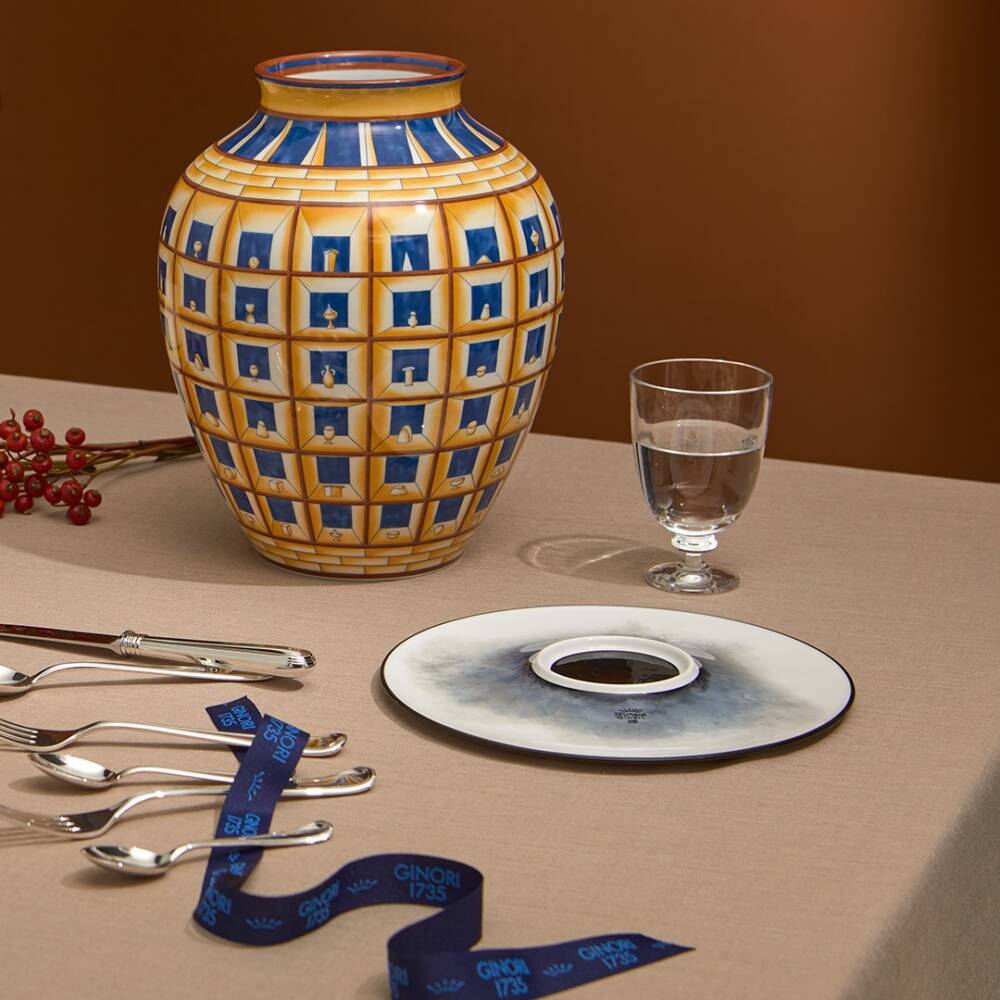 Questo vaso è una delle opere più note di Gio Ponti e rivela la sua formazione di architetto nel titolo, nella serie di vasetti che occupano le celle e nella resa prospettica delle celle stesse, che preludono la visione da un unico punto di vista. L’esemplare qui presentato ha dimensioni ridotte rispetto a quello ideato da Ponti, la cui forma con i riquadri a rilievi fu eseguita a partire dal 1923, mentre questo tipo di decoro è datato 1925. Richard Ginori presenta questo vaso in porcellana con l’effetto illusionistico del rilievo e con il decoro studiato in decalcomania. Le conoscenze dei maestri e dei tecnici della Manifattura hanno permesso di evocare un’opera di Ponti avvalendosi delle moderne tecnologie, come lo stesso Ponti aveva auspicato proponendo, per alcune sue creazioni, l’intervento di varie tipologie di decoro. In questo caso, la Manifattura ha tradotto in una visione lineare il decoro, studiando l’aderenza dello stesso a una superficie con forte rastrematura verso l’alto e verso il basso. Decorato a mano, in decalcomania, viene impiegata la tecnica del ‘taglio in doppio’ al fine di mantenere il medesimo spessore dell’incorniciatura delle celle.
