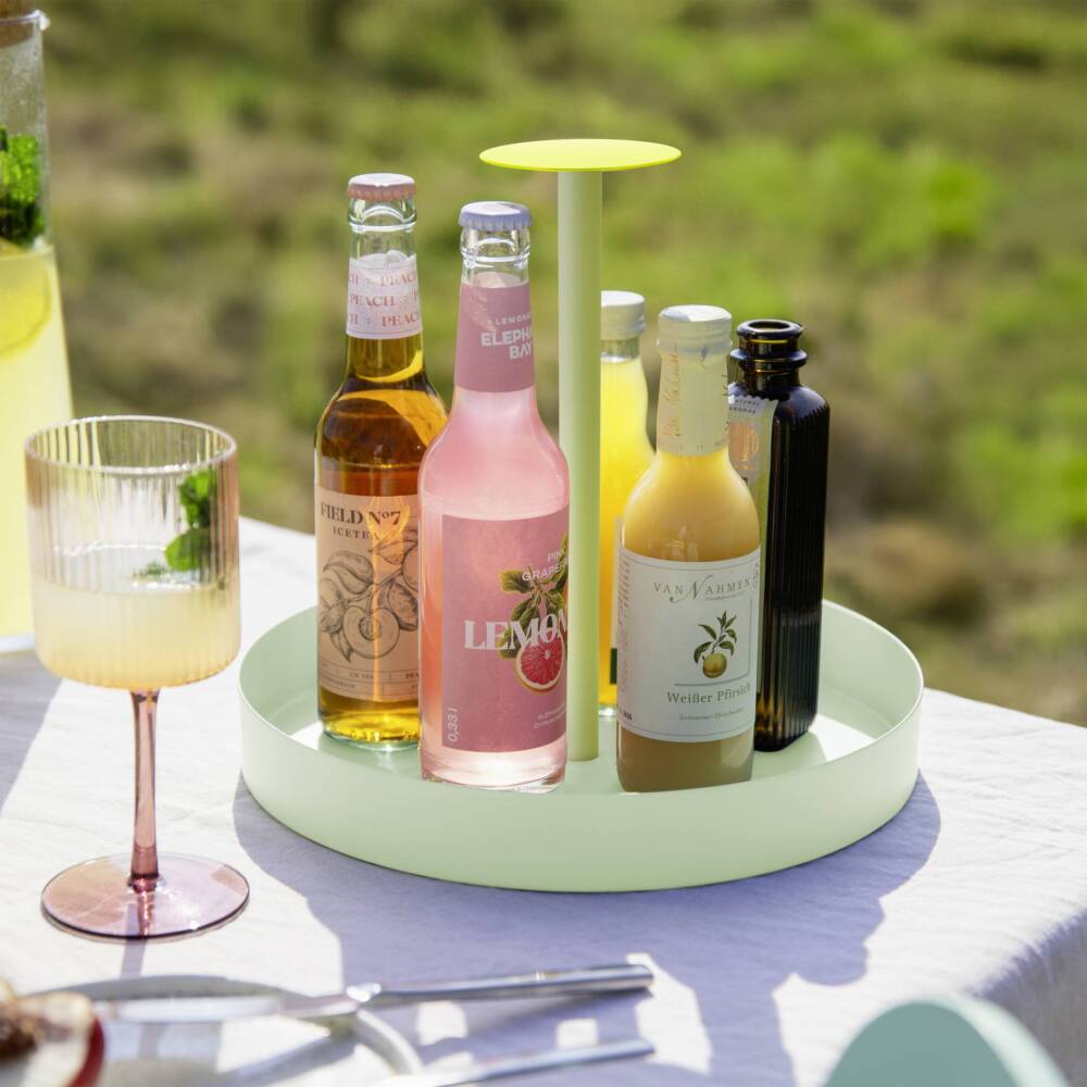 Vassoio portaoggetti Realizzato in metallo verniciato a polvere, dalla forma semplice e rotonda con una pratica maniglia, che consente di trasportare Nana senza sforzo dalla cucina al soggiorno o dalla sala da pranzo alla terrazza. Il vassoio è perfetto per servire bevande e snack, bottiglie di aceto e olio e spezie.