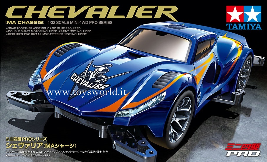 18658 Chevalier il modello da costruire delle mitiche mini4wd .auto con 4 ruote motrici dotata di motore elettrico.funziona con 2 pile stilo AA . carrozzeria già colorata e adesivi compresi nella confezione.tantissime possibilità di variare estetica e dinamica con pezzi di ricambio e motori da gara in vendita a parte.