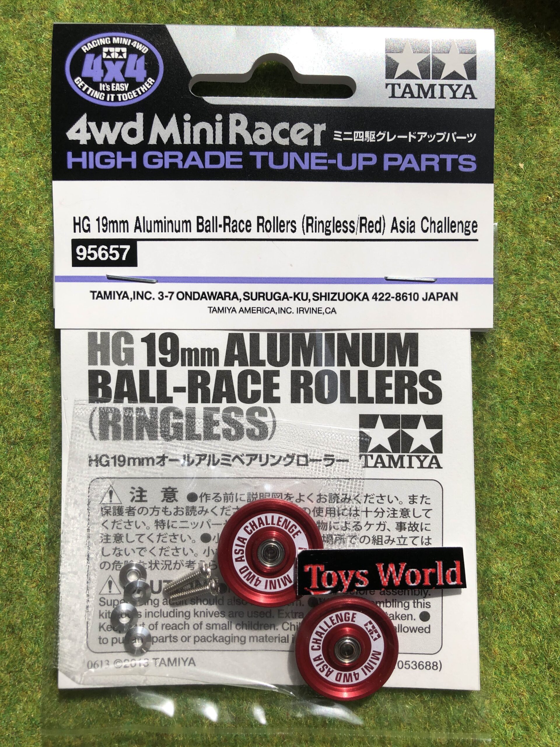 • Queste rotelle anodizzate RED hanno la scritta “MINI 4WD ASIA CHALLENGE” e il logo Tamiya stampato in bianco da un lato.