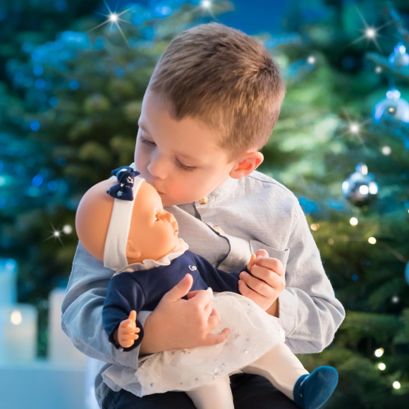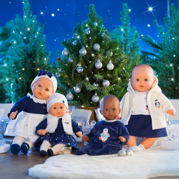 Anais ha un corpo flessibile e questo le permettere di assumere le stesse posizioni di un bambino vero. Il viso, le gambe e braccia sono in vinile dal delicato profumo di vaniglia e morbido al tatto. Indossa un abito blu e bianco con lunghe maniche e il colletto color argento, la gonna invece è tempestata da mille e più stelline argentate, collant bianche e ballerine blu. Completa il suo out fit una fascia bianca con un vaporoso fiocco.