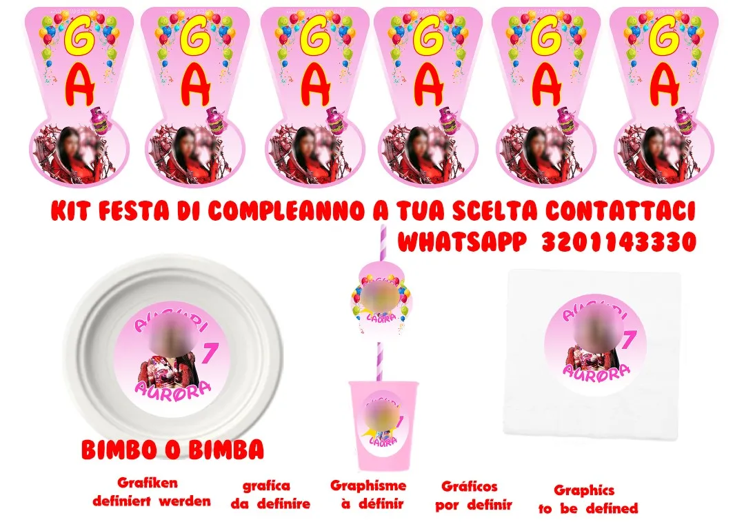 Immagini da definire a tua scelta. Contattami. TRASFORMA LA SUA FESTA IN UN MOMENTO PERFETTO! Kit comprensivo di tutto il necessario per un party senza paragoni! 1 Festone Auguri 8 Cannucce 12 Bicchieri 8 Tovaglioli 8 Piatti Un fantastico set per decorare del tema scelto la festa COMPRA IL KIT FESTA PER RENDERE UNICA LA TUA FESTA! Personalizza i tuoi eventi, che sia un battesimo, una nascita, un compleanno, un matrimonio utilizzando i nostri prodotti così da dare originalità e unicità al tuo party, sorprendi i tuoi invitati con i nostri prodotti. E C O N O M I C…