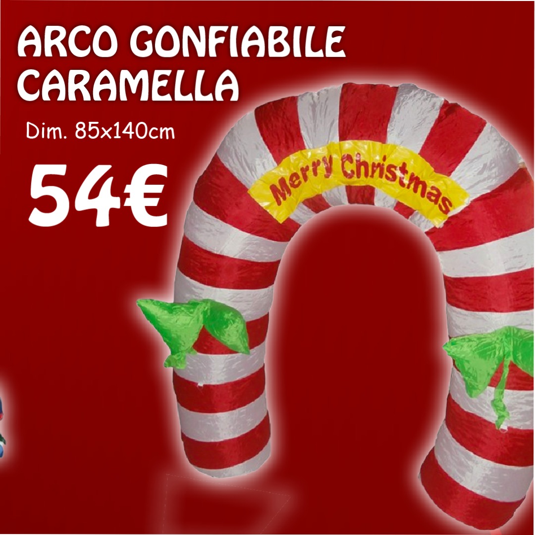 Arco gonfiabile natalizio in nylon dim. 85×140 cm. Alimentazione con presa elettrica, motorino e luce interna inclusi. Con striscione “merry Christmas” removibile. Sottocosto per liquidazione magazzino