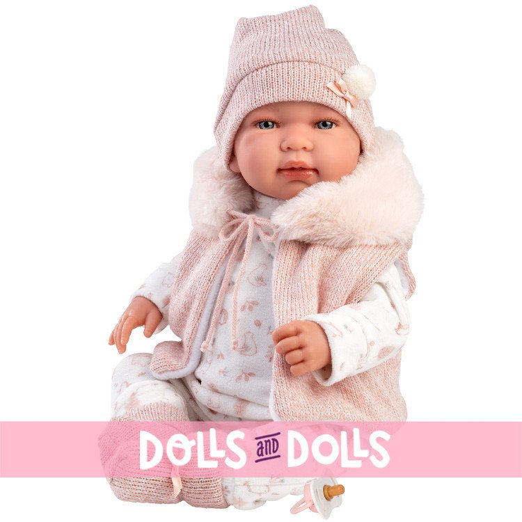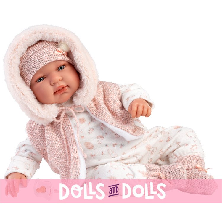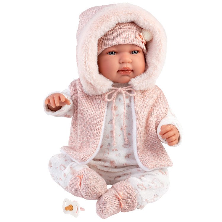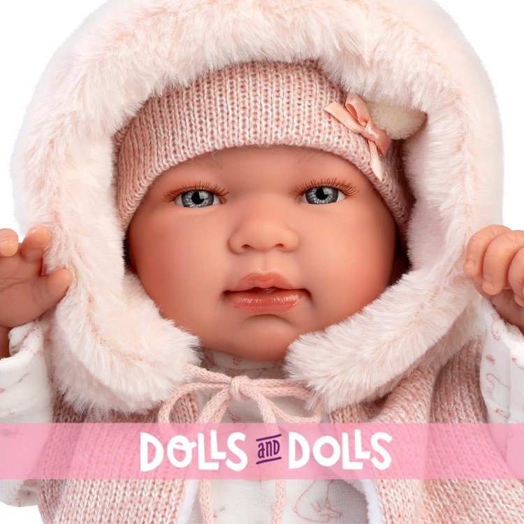 Tenendola in braccio ti sembrerà di cullare un vero bambino! I suoi intensi occhi azzurri, le piccole manine e le guanciotte paffute chiamano coccole. Sulla tutina color avorio delicati disegni rosa, una giacca di lana con un caldo cappuccio, Tina è pronta per infinite passeggiate da farsi con la sua nuova mamma. Realizzata dalle sapienti mani degli artigiani Llorens Tina è impreziosita da abiti realizzati da importanti produttori dell’abbigliamento per bambini, curati con la stessa attenzione e amore.