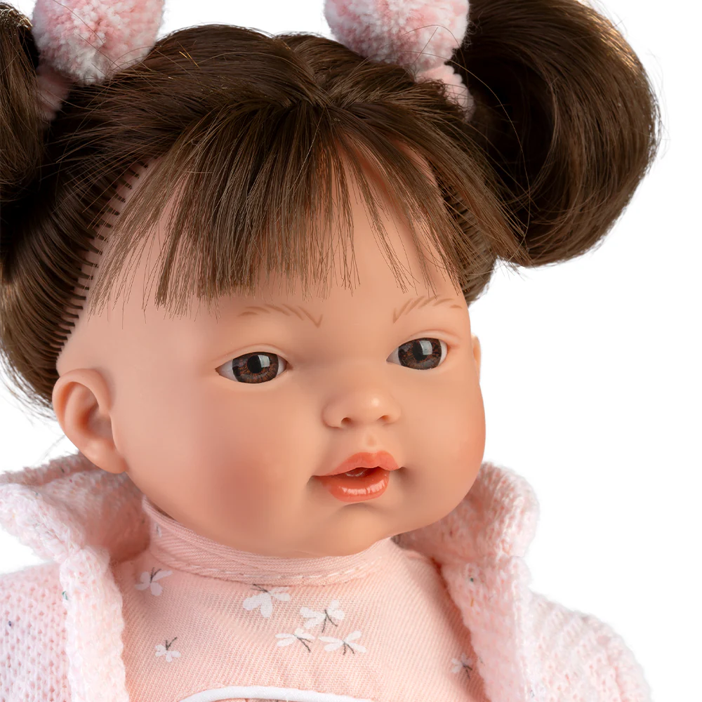 Codini castani, un vestitino rosa/pesca decorato con bianchi fiorellini e una giacca di lana, look perfetto per uscire in compagnia della sua nuova amica. Realizzata dalle sapienti mani degli artigiani Llorens. Ogni bambola è coccolata impiegando solo materiali di prima qualità, e impreziosite dagli abiti realizzati da importanti produttori dell’abbigliamento per bambini, curati con la stessa cura e amore.