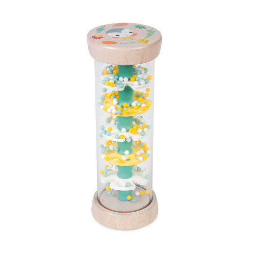 Colori tenui e i decori freschi, per un primo approccio alla musica, stimolando anche la vista dei più piccoli, grazie alle perline visibili attraverso le pareti trasparenti. Girando il bastone, le perline di 3 colori passano attraverso 5 eliche di legno di 2 forme diverse riproducendo il suono dolce della pioggia. Il design ergonomico e le dimensioni ridotte di 17 cm consentono una facile manipolazione, anche per le manine dei più piccoli! A partire dai 6 mesi.