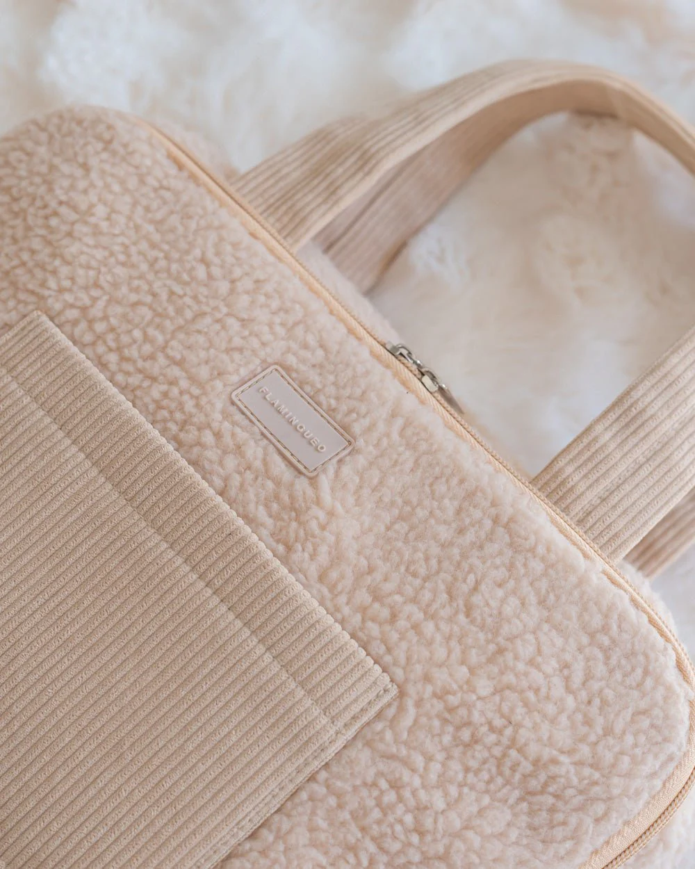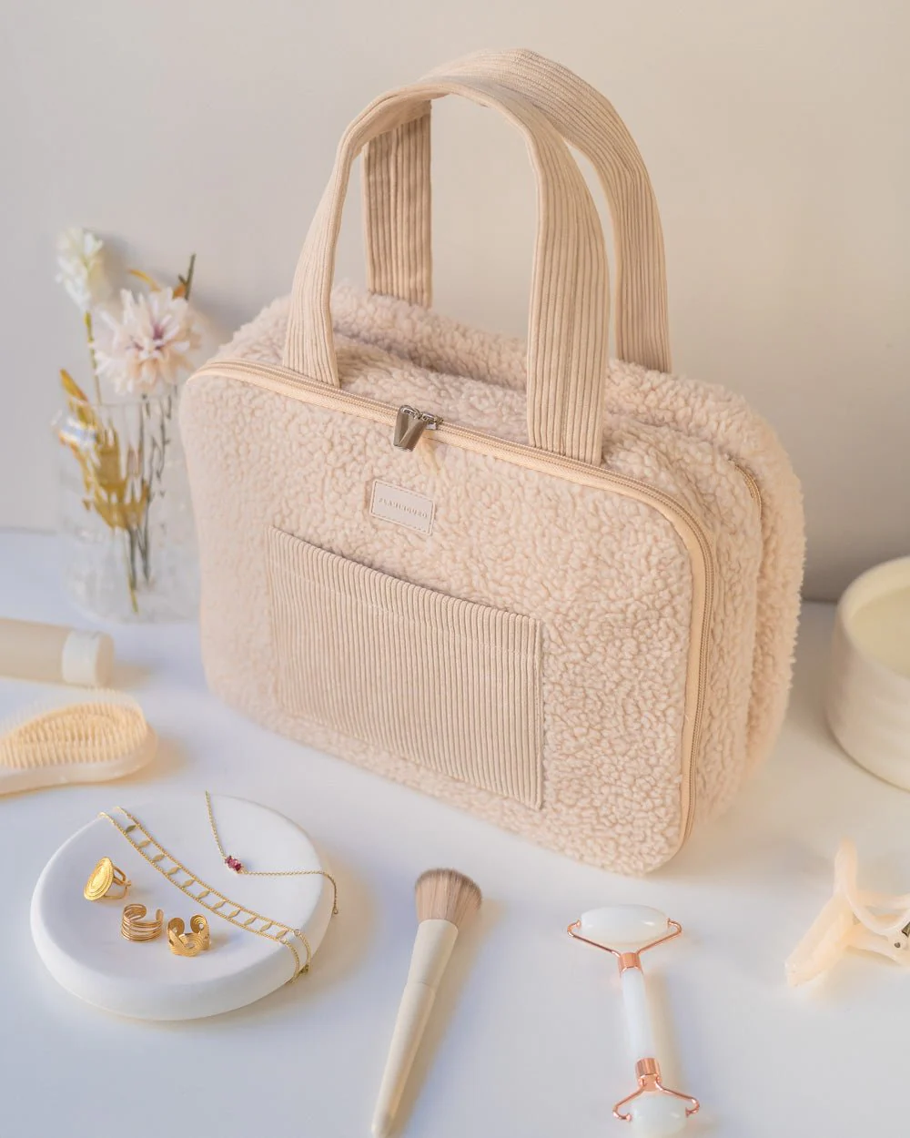 Grande beauty case pieghevole, realizzato in morbidissimo tessuto effetto peluche. È dotato di diversi scomparti interni per organizzare sia i trucchi che i gioielli. Ideale per proteggere i tuoi prodotti di bellezza essenziali quando viaggi e il gancio in metallo ti permette di gestirlo anche verticalmente.