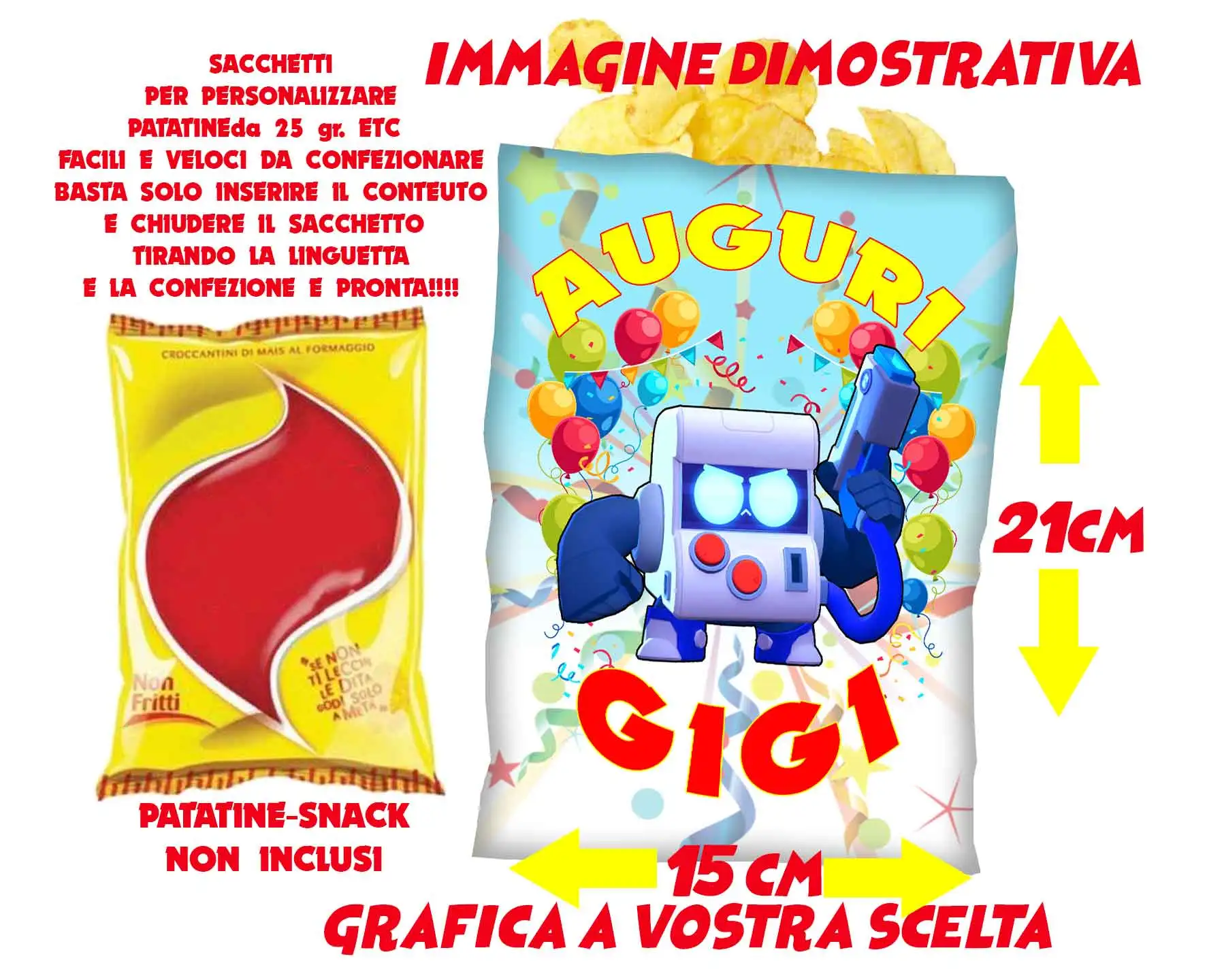 sacchetti per patatine snack personalizzate CON LINGUETTA PER CHIUSURA AUTOMATICA DOPO AVER INSERITO IL PRODOTTO FACILI DA CHIUDERE !!!! https://malatigeniali.it/wp-content/uploads/2023/10/patasq.mp4 UTILIZZIAMO SOLO ARTICOLI DI OTTIMA QUALITÀ. DETTAGLI: Confezione per patatine snack personalizzate con personaggio a tema scelto!!!! SCEGLI IL PRODOTTO CHE PREFERISCI, SELEZIONA LE SPECIFICHE DAI MENÙ A TENDINA E CLICCA SU COMPRALO SUBITO. CONTROLLA L’ORDINE EFFETTUATO E CLICCA SU ACQUISTA. UNA VOLTA ACQUISTATO IL PRODOTTO, PROCEDI AL PAGAMENTO. IL PRODOTTO VERRÀ SPEDITO CON CORRIERE ESPRESSO ENTRO 36H LAVORATIVE DALLA RICEZIONE DEL PAGAMENTO. SI PREGA DI INSERIRE NELLE NOTE UN RECAPITO TELEFONICO PER IL CORRIERE GRAZIE!!!