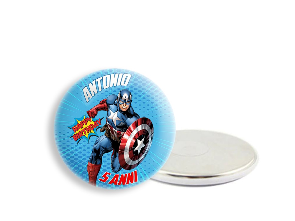 Calamite rotonde di metallo Ø 58mm personalizzabili con qualsiasi personaggio o soggetto e con nome ed anni del festeggiato/a.