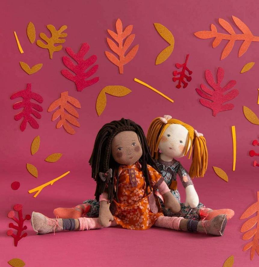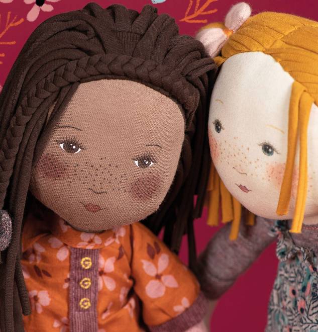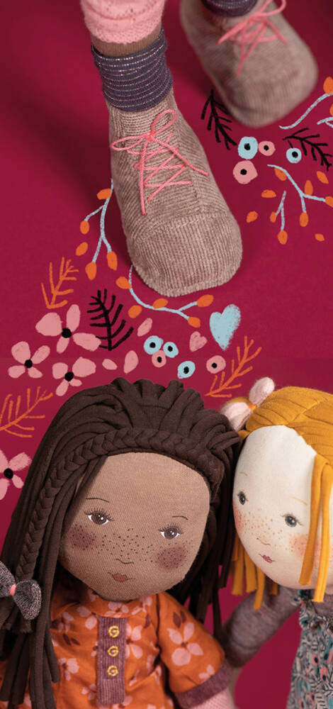 Immaginate e illustrate da Cécile Blinderman, les Rosalies evocano con poesia e fascino, un universo di delicatezza infinita… Bambole di pezza con dolci visi illustrati dalle guance color rosa cipria, per raccontare storie con gli amici. Sono vestiti con preziose scarpette da ballo, abiti arruffati e pantaloni anni ’70. Ognuno ha il nome di un fiore scritto sulla scatola di cartone con la sua immagine. Il disegno è delicato, su uno sfondo colorato e fiorito, troviamo il loro ritratto con il loro piccolo animale in braccio… Cannella è un’anima romantica e briosa. Le piace correre dietro alle farfalle, respirare l’area…