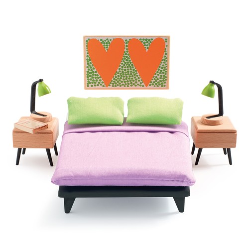 Una camera dal design molto contemporaneo, ideale per arredare la tua casa delle bambole. Questi mobili colorati in cui il legno è onnipresente sono ricchi di dettagli e accessori realistici, in modo che i bambini possano sviluppare liberamente la loro immaginazione inventando le storie più belle. Adatta per giocare con le case delle bambole Cubic House o Color House di Djeco. Contenuto: 1 letto matrimoniale, 1 materasso con lenzuolo, 2 cuscini, 2 comodini, 2 lampade da comodino, 1 libro, 1 tavolino.