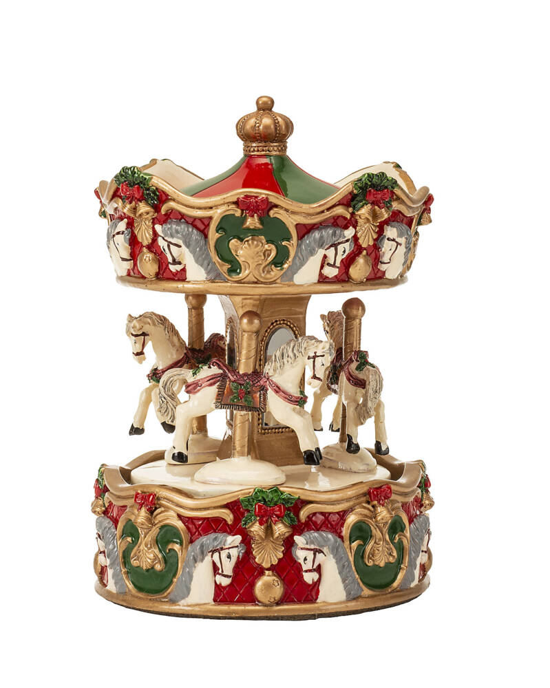 Musica e movimento per questo carillon dal gusto vintage. La palette colori in cui prendominano il rosso e il verde, viene spezzata dal candore dei cavalli bianchi, riportati anche alla base e nella parte superiore in cui i due colori tornano come tonalità brillanti. Un elegante flash back che risveglierà i ricordi e scalderà il tuo dolce Natale. E per i più piccini sarà subito atmosfera di festa.