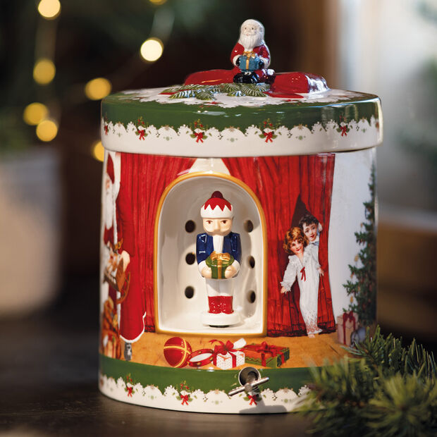 La sagoma di un pacchetto regalo nasconde un porta candela di grande effetto che sorprenderà ancor più la con la melodia “Astro del ciel”, ogni qual volta verrà messo in funzione il suo carillon. La collezione Christmas Toys unisce momenti nostalgici e design moderno in un mondo meraviglioso e festoso in cui allegri personaggi prendono vita.