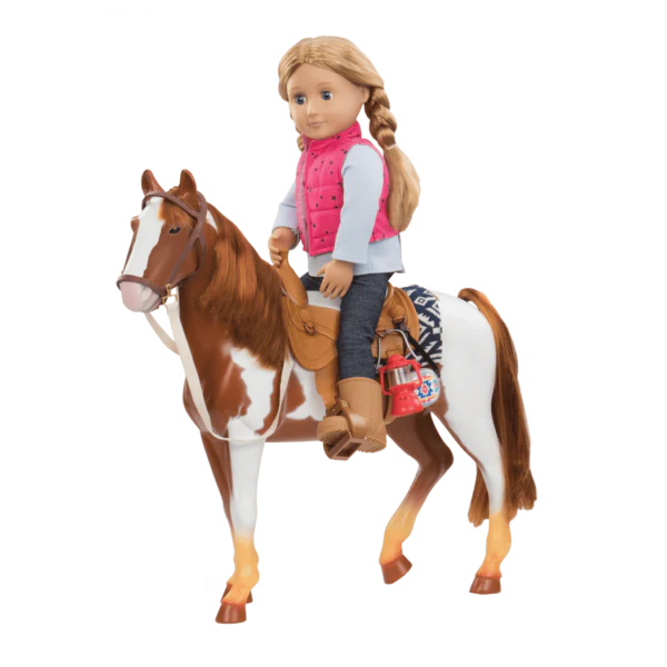 Galoppa verso i tuoi sogni con Pinto, un bellissimo puledro dal manto pezzato marrone e bianco. Con lui sella e sotto-sella intrecciato e tanti accessori per scoprire i sentieri inesplorati della campagna. Adatto a bambole da 46 cm, vendute separatamente.