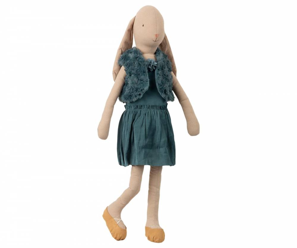 Splendida coniglietta ballerina, vestita color petrolio. 66cm di eleganza e grazia. Un’amica fedele per le aspiranti bambine ballerine dallo spiccato senso estetico. I tessuti potrebbero variare rispetto alle fotografie, ma in assoluto rispetto dello stile e gusto Maileg.