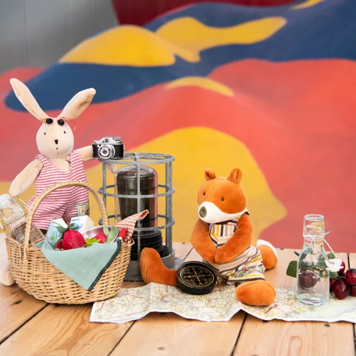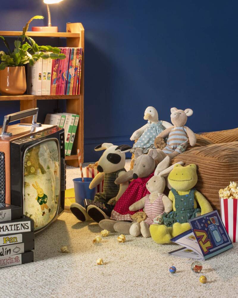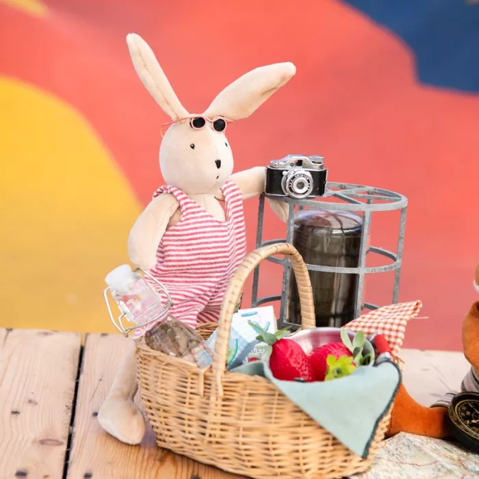 Sylvain, il tenero coniglio della grande famiglia. Disponibile in diverse misure 50-30 o 20 cm. Indossa una tutina rigata e ha lunghe orecchie morbide a cui affidarsi! Nini, un simpatico topolino, Sylvain, un coniglio dispettoso, Camille, una buffa tartaruga… Questa allegra compagnia della grande famille per il massimo piacere dei più piccoli…