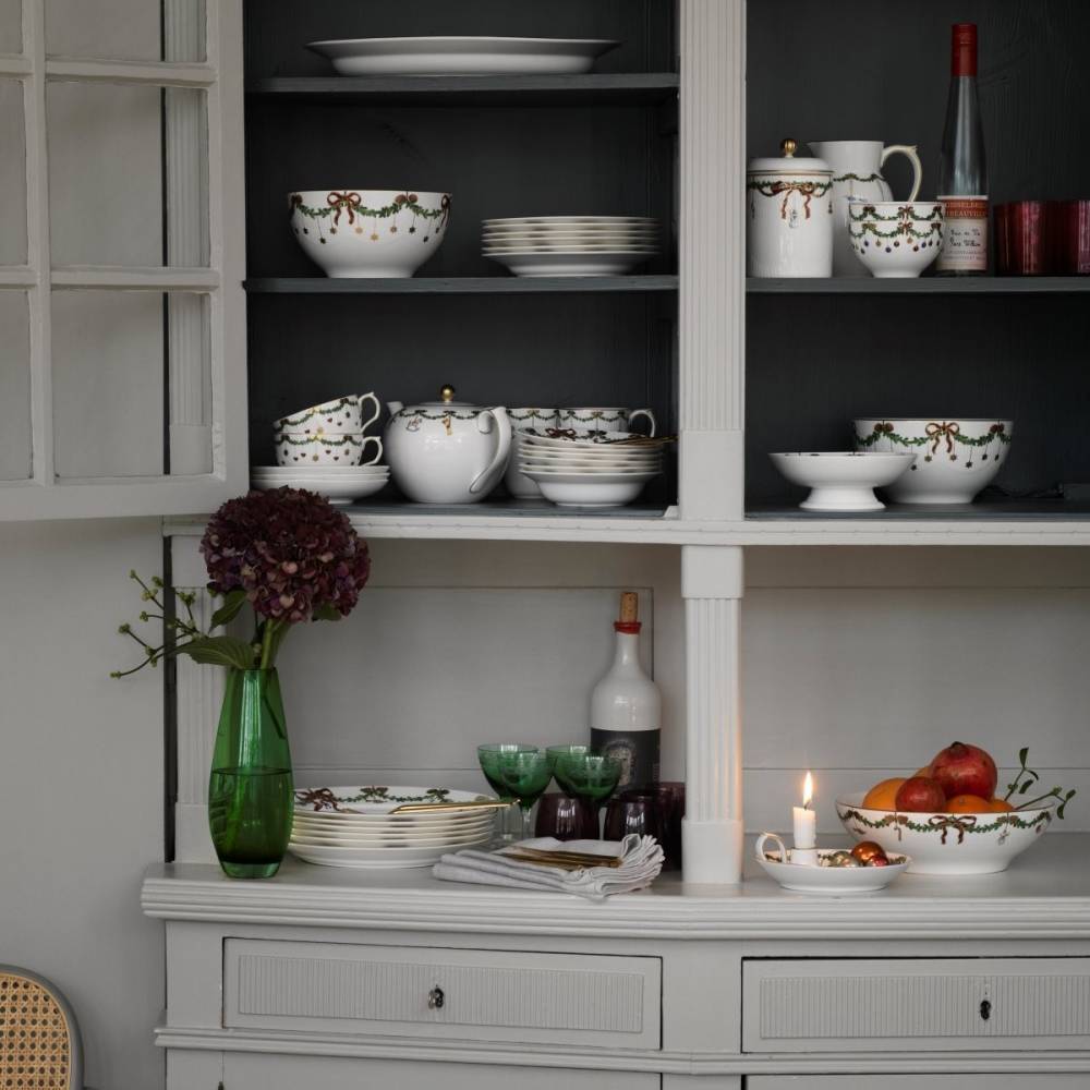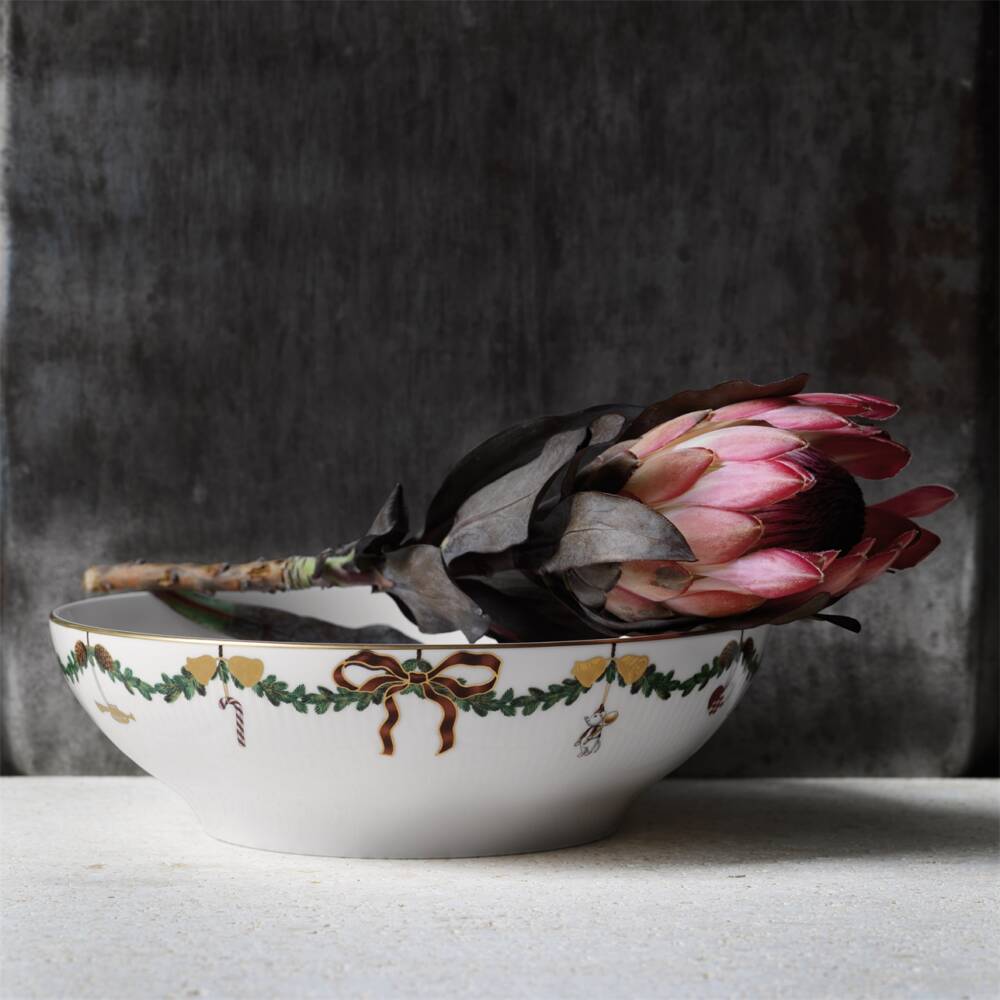 Una magnifica coppa di 25 cm ideale come piatto da portata, ma anche come elemento decorativo su un tavolo, una mensola….Il delicato profilo rivestito d’oro è arricchito dal decoro di una ghirlanda di abete rosso con i classici ornamenti natalizi che si trovano sugli alberi di Natale danesi. Star Fluted è il decoro che entra nelle tradizioni familiari, ribadendo lo spirito del Natale, il riunirsi intorno a un tavolo per i momenti di gioia e di unione o sorseggiare una calda bevanda in un clima sereno. Royal Copenhagen è un marchio danese molto amato e di grande prestigio, non solo…