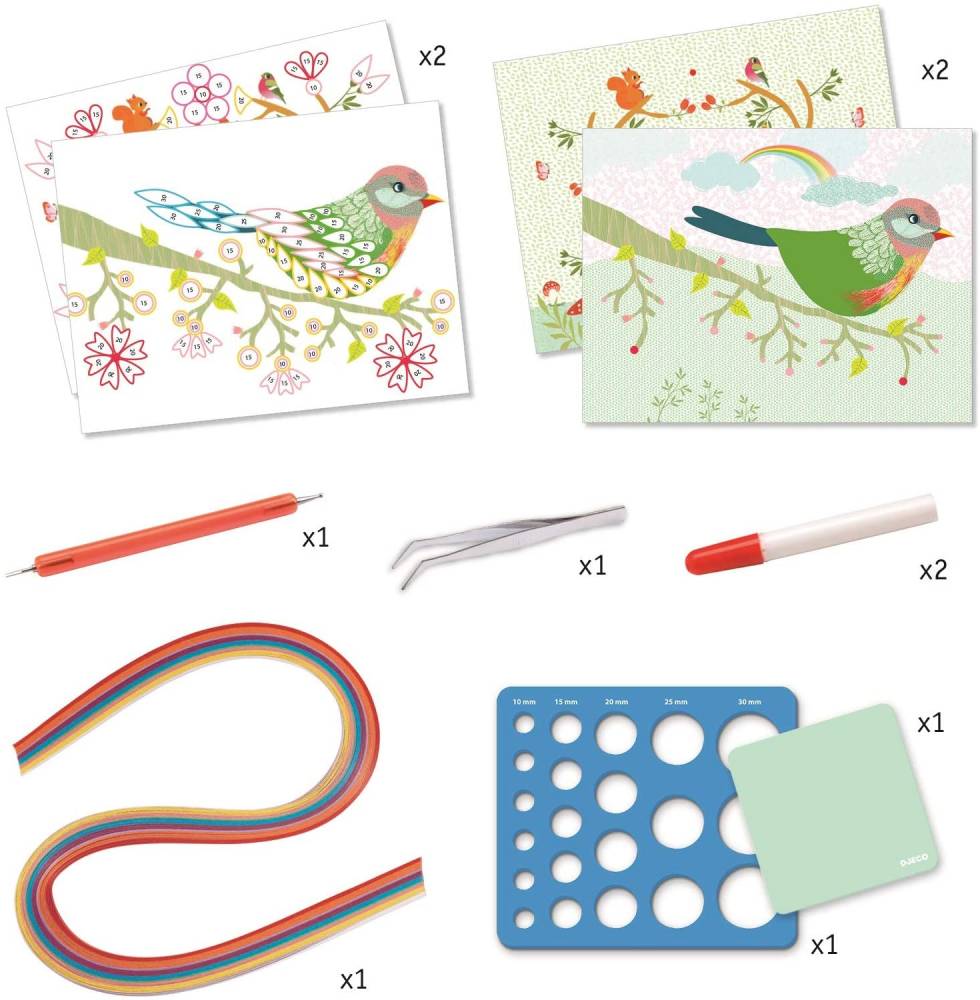 Questo set offre ai bambini l’opportunità di scoprire l’arte del “quilling” o “paperolles”, un grande classico artigianale che consiste nel comporre tavoli con spirali di carta. Strumenti adattati e una tecnica semplificata consentono al bambino di completare facilmente le 2 tabelle proposte. Avvolge le strisce multicolori per formare anelli, cerchi e altre navette, quindi le incolla sugli sfondi illustrati. Il piumaggio dell’uccello e le corna del cervo sono adornate con motivi a spirale mentre il volume.