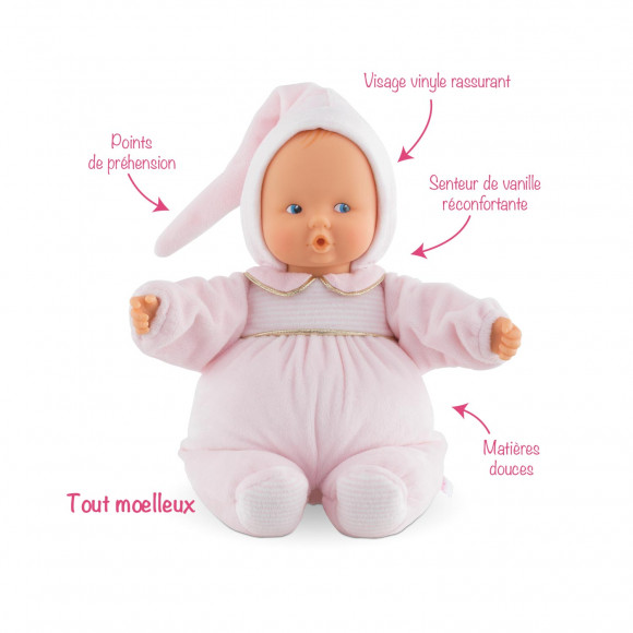 Soffice, soffice ! Pensato perché possa diventare il compagno inseparabile del tuo piccolo fin dalla nascita, il doudou di Corolle, non delude le aspettative. Le sue dimensioni e la leggerezza sono i suoi punti di forza. Il corpo in tessuto, il dolce viso in vinile tanto morbido al tatto e il delicato profumo di vaniglia rassicureranno il tuo piccolo durante la crescita.