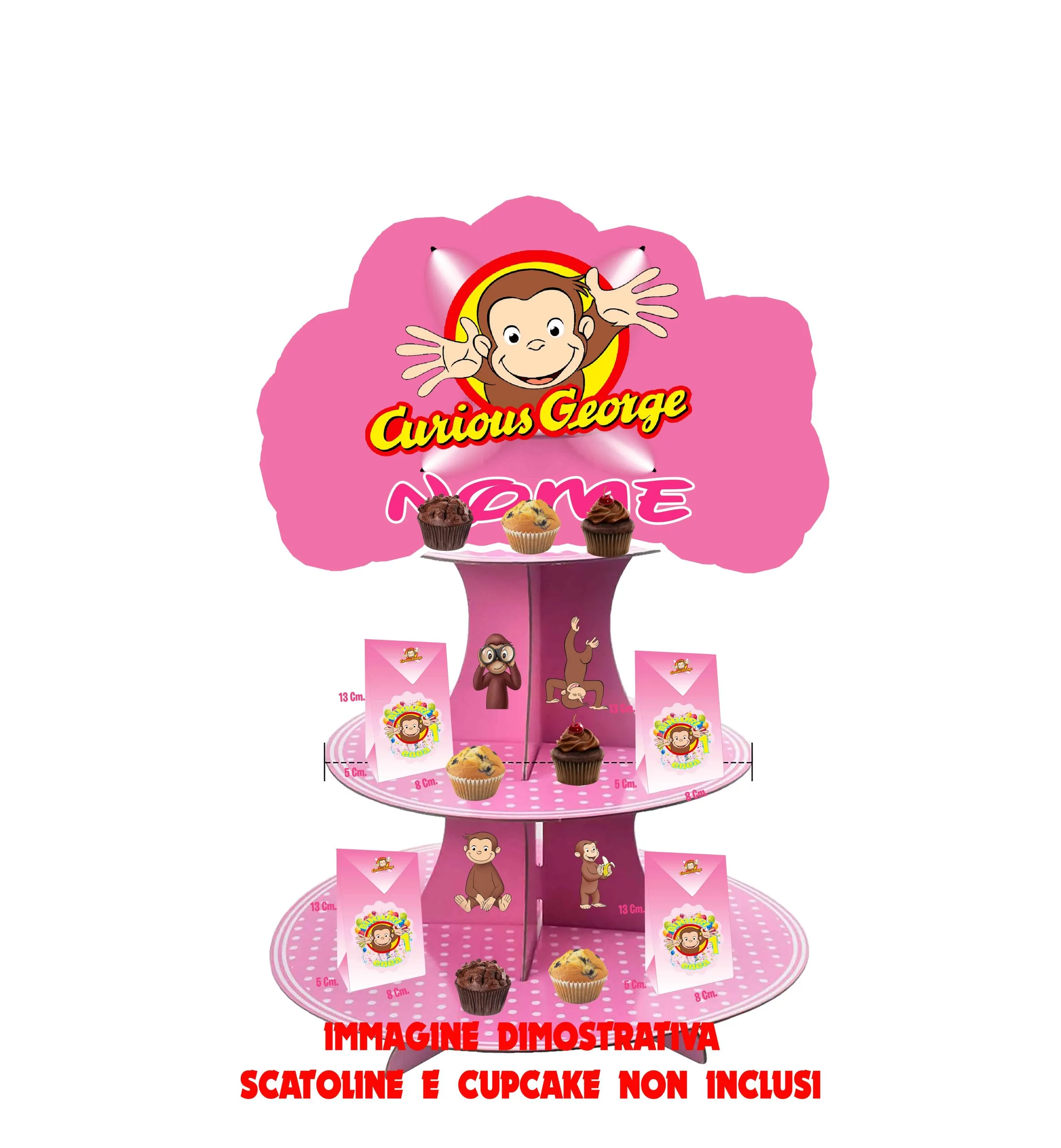 George and friends ALZATINA Scenografica per Compleanno Se avete in mente di realizzare una splendida tavolata di dolci ,creazioni, avrete di sicuro bisogno di questa alzatina in modo tale che i cup cakes, le mini torte, le crostatine o gli accessori possono essere ben visibili. Nella confezione troverete 3 vassoi tondi in cartone rigido di diversa dimensione e la colonna su cui poggiarli sempre in cartone rigido. A tre piani, è perfetta per decorare la tavola o per servire i cupcakes o altre decorazioni. Può essere utilizzata sia con i dolci che con accessori .Dimensioni: 35 cm h .