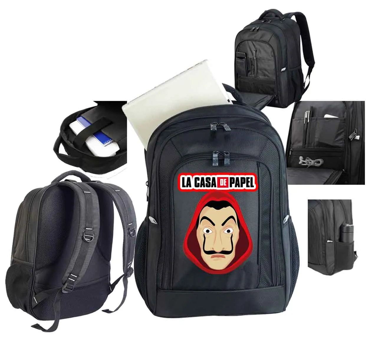 La Casa De Papel Zaino 100% micro rip-stop poliestere pannello posteriore imbottito tasca frontale con cerniera Bretelle imbottite e regolabili scompartimenti per accessori Scomparto per alloggio smartphone scompartimento laptop imbottito adatto per tutti i tipi di laptop con schermo fino a 15.4 tasche laterali in mesh occhiello per auricolari capacità: 30 Litri dimensioni: 48 x 32 x 20 cm