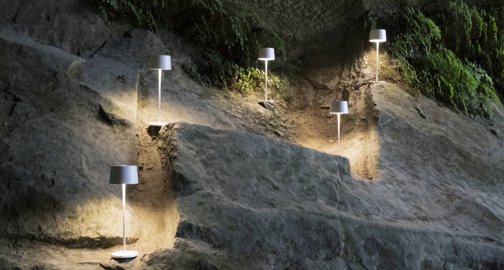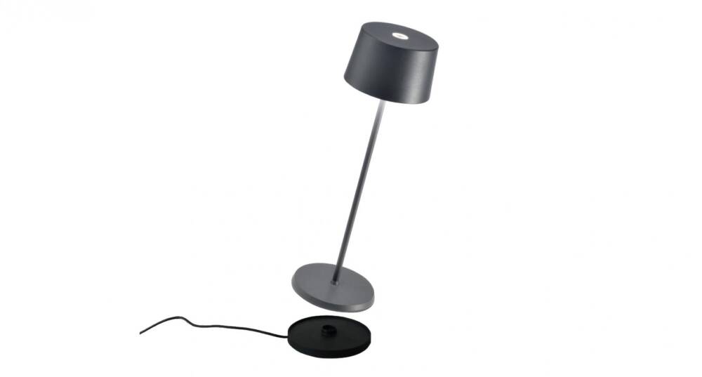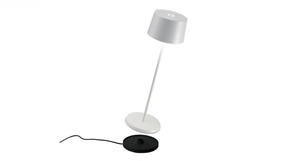 Lampada a batteria portatile e ricaricabile da tavolo. È dotata base di ricarica a contatto, touch dimmer e della funzione di memoria dell’impostazione di dimmerazione che memorizza gli step, in modo che ad ogni accensione, l’intensità luminosa corrisponderà a quella precedentemente impostata. La lampada è inoltre dotata della funzione di selezione della temperatura di colore della luce tra 2700 e 3000° Kelvin (bianco dinamico).