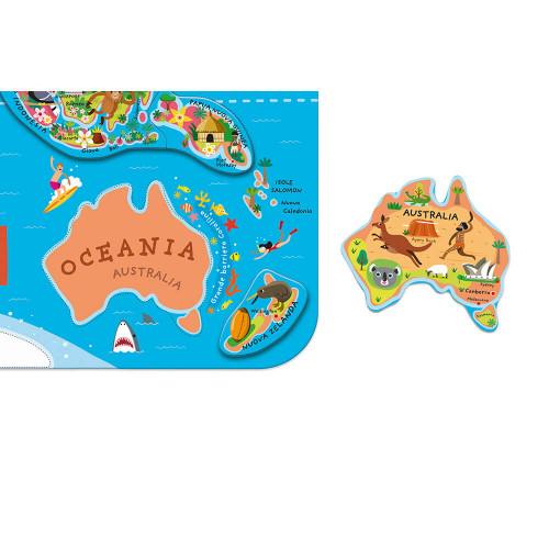 PUZZLE MAGNETICO DEL MONDO VERSIONE ITALIANA 92 PEZZI (LEGNO) Il giro del mondo in 92 magneti! Ogni magnete rappresenta un Paese o una regione del mondo, la sua capitale e un’illustrazione tipica di quella parte del globo. Il grande tabellone magnetico rappresenta il mondo con i suoi continenti, i suoi mari e i suoi oceani : i colori utilizzati per ciascuna ragione aiutano a non perdere l’orientamento. Divertiti a rimettere ogni Paese al posto giusto per ottenere una magnifica mappa del mondo da appendere alla parete. Un modo didattico e divertente di scoprire il pianeta. Preparati a fare il giro…