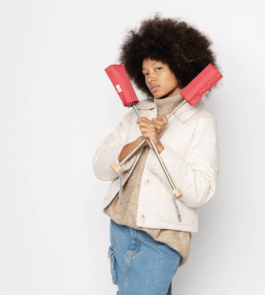 MATERIALE: fodera 100% poliestere microfibra riciclato (rPET) | bottone automatico acciaio inossidabile | manico legno naturale | cinturino grosgrain | cover microfibra polyestere