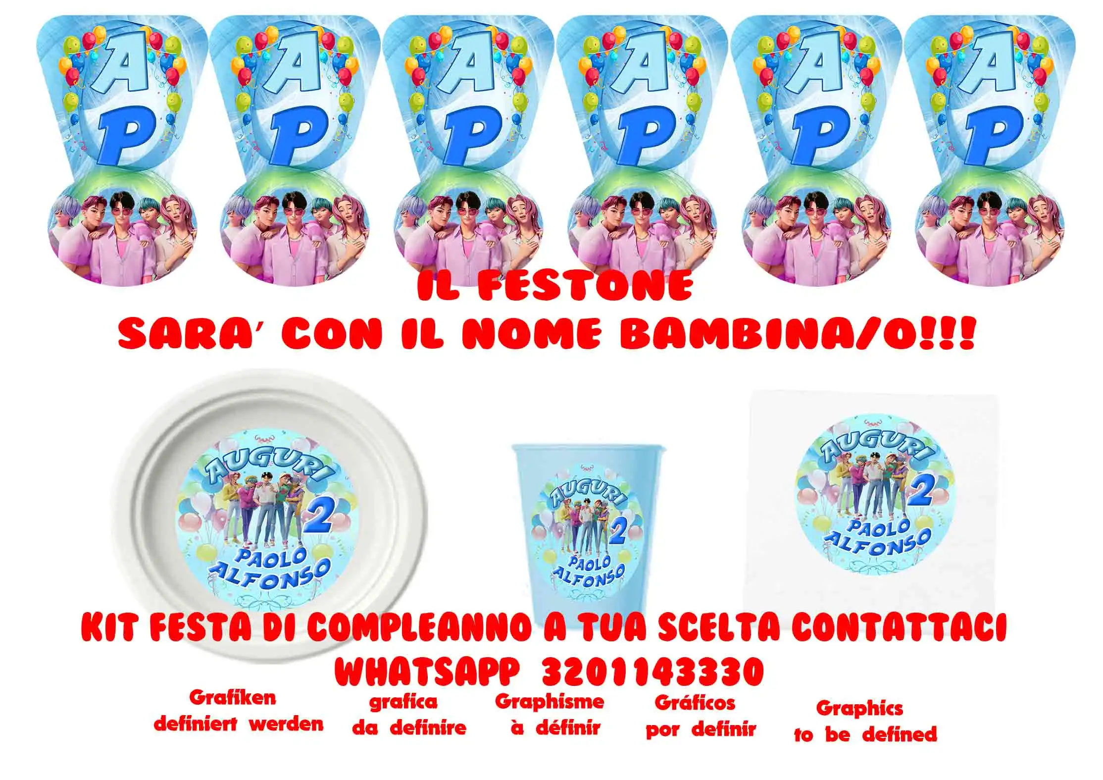 Festa Compleanno a tema TRASFORMA LA SUA FESTA IN UN MOMENTO PERFETTO! Kit comprensivo di tutto il necessario per un party senza paragoni! 1 Festone Auguri 12 Bicchieri 8 Tovaglioli 8 Piatti Un fantastico set per decorare del tema scelto la festa COMPRA IL KIT FESTA PER RENDERE UNICA LA TUA FESTA! Personalizza i tuoi eventi, che sia un battesimo, una nascita, un compleanno, un matrimonio utilizzando i nostri prodotti così da dare originalità e unicità al tuo party, sorprendi i tuoi invitati con i nostri prodotti. E C O N O M I C O, S E M P…