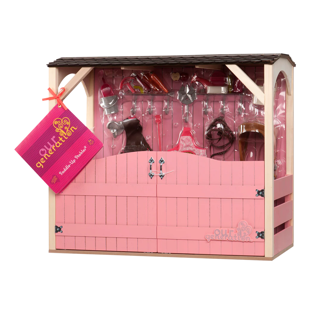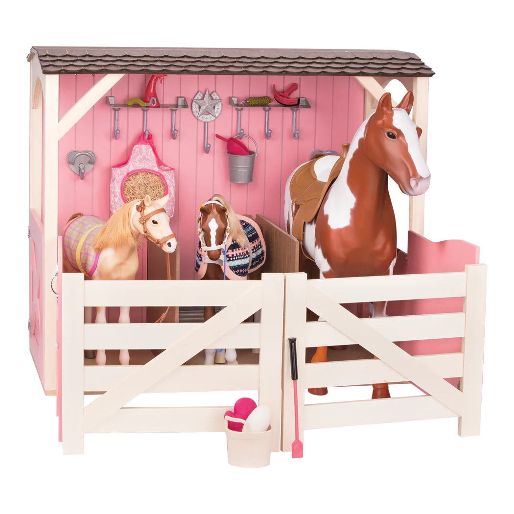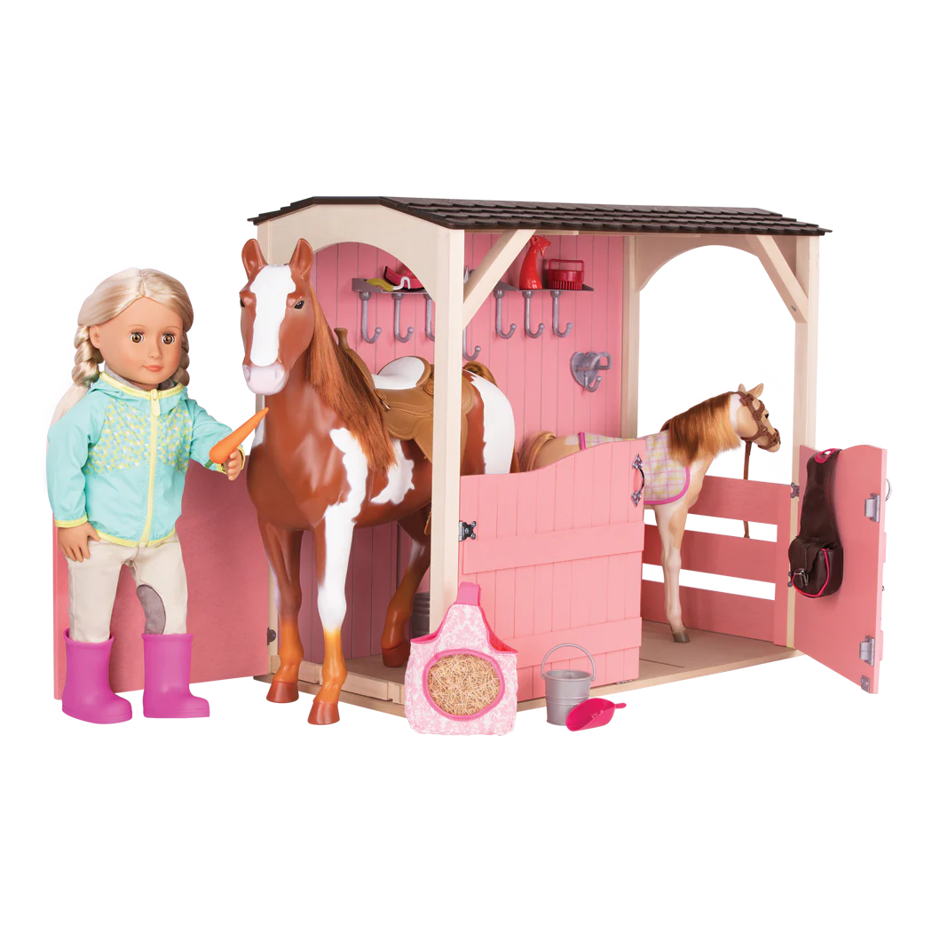 La grande scuderia è adatta a cavalli di 50 cm e alle bambole da 46 cm. Robusta e resistente, perché realizzata in legno, è al tempo stesso leggera e facile da trasportare. Può ospitare fino a tre cavalli e grazie alle recinzioni puoi creare un accogliente paddock. Con la carota, la mela, il sacco per il fieno e il secchio potrai premiare i tuoi cavalli dopo un divertente giro in pista, con la spazzola, il guanto, e gli altri strumenti, potrai invece prenderti cura di loro durante la toilettatura. Bambole e cavalli venduti separatamente.