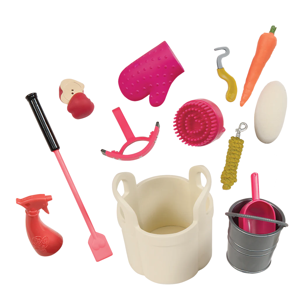 Include: fienile, due recinzioni, accessori per il cibo e attrezzi per la toilettatura.