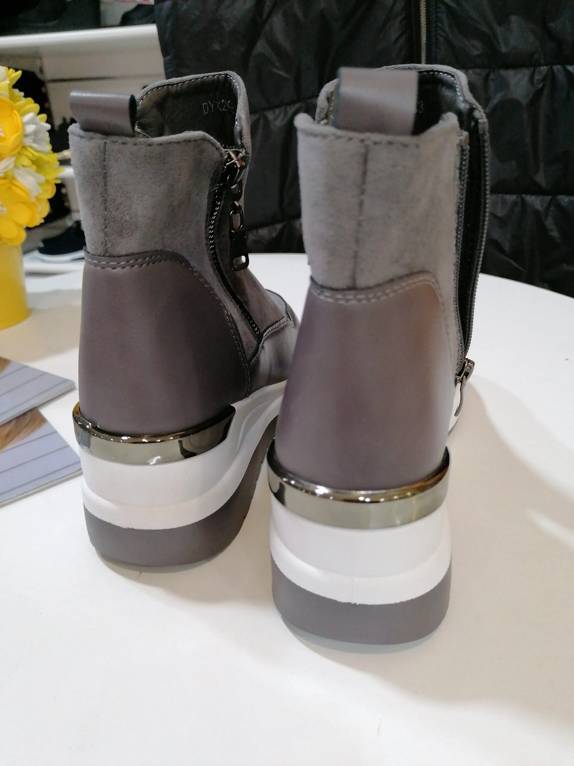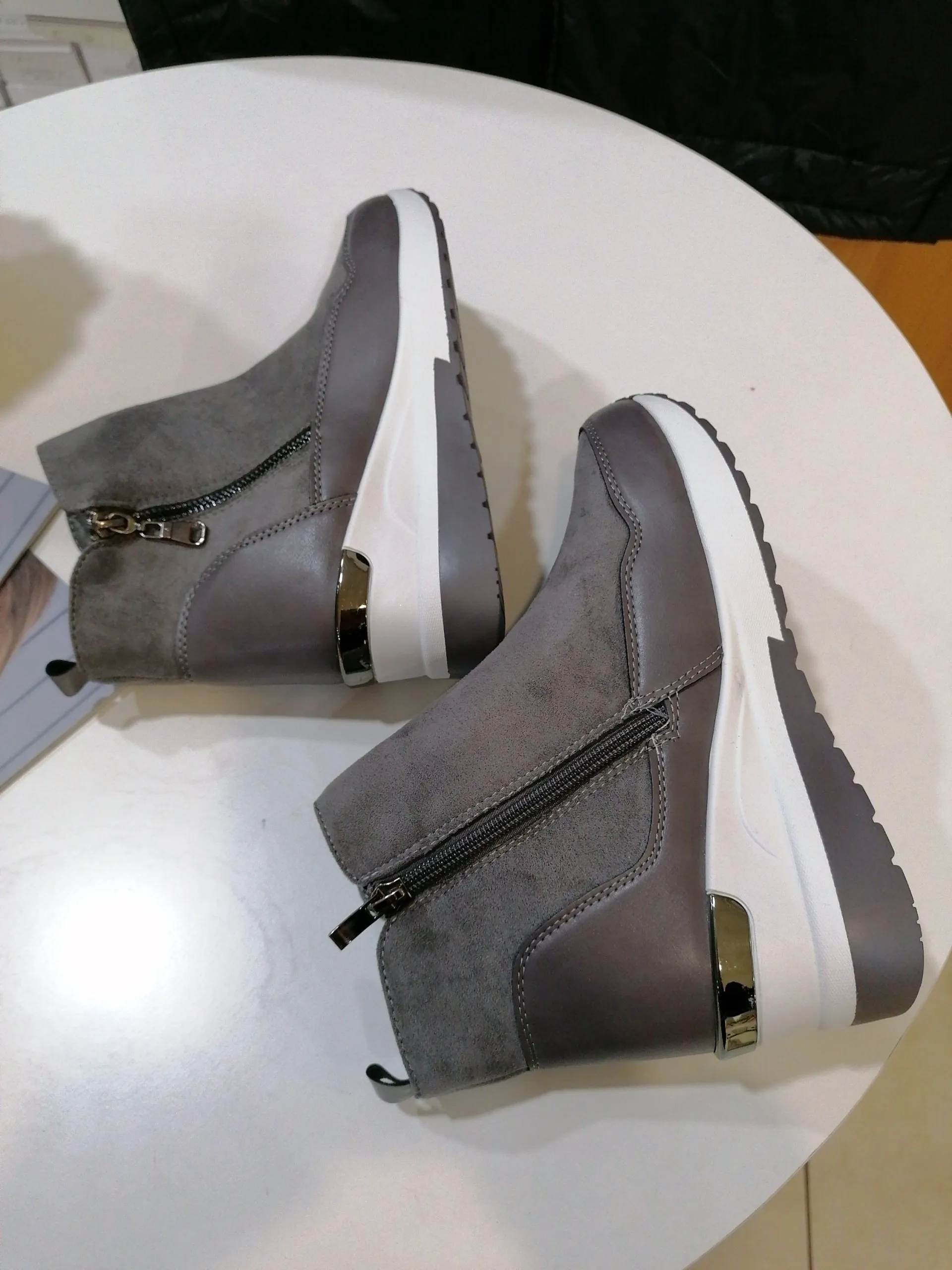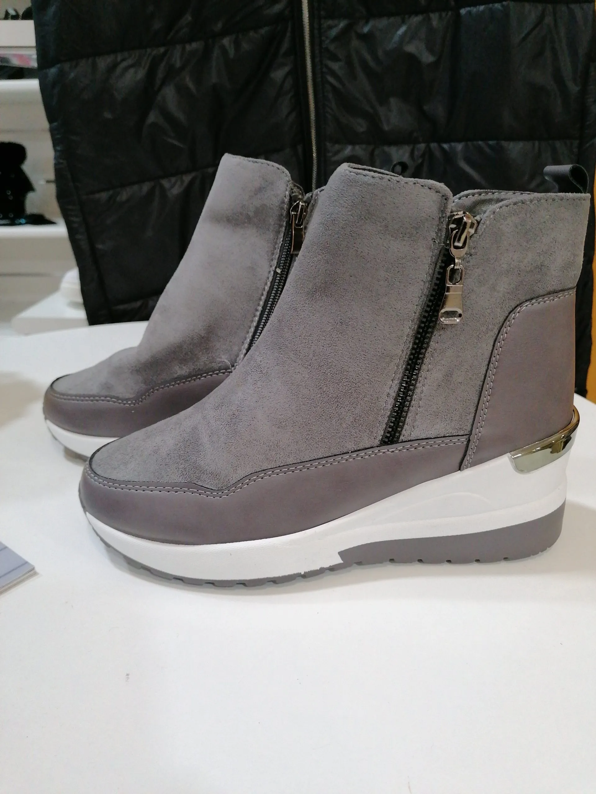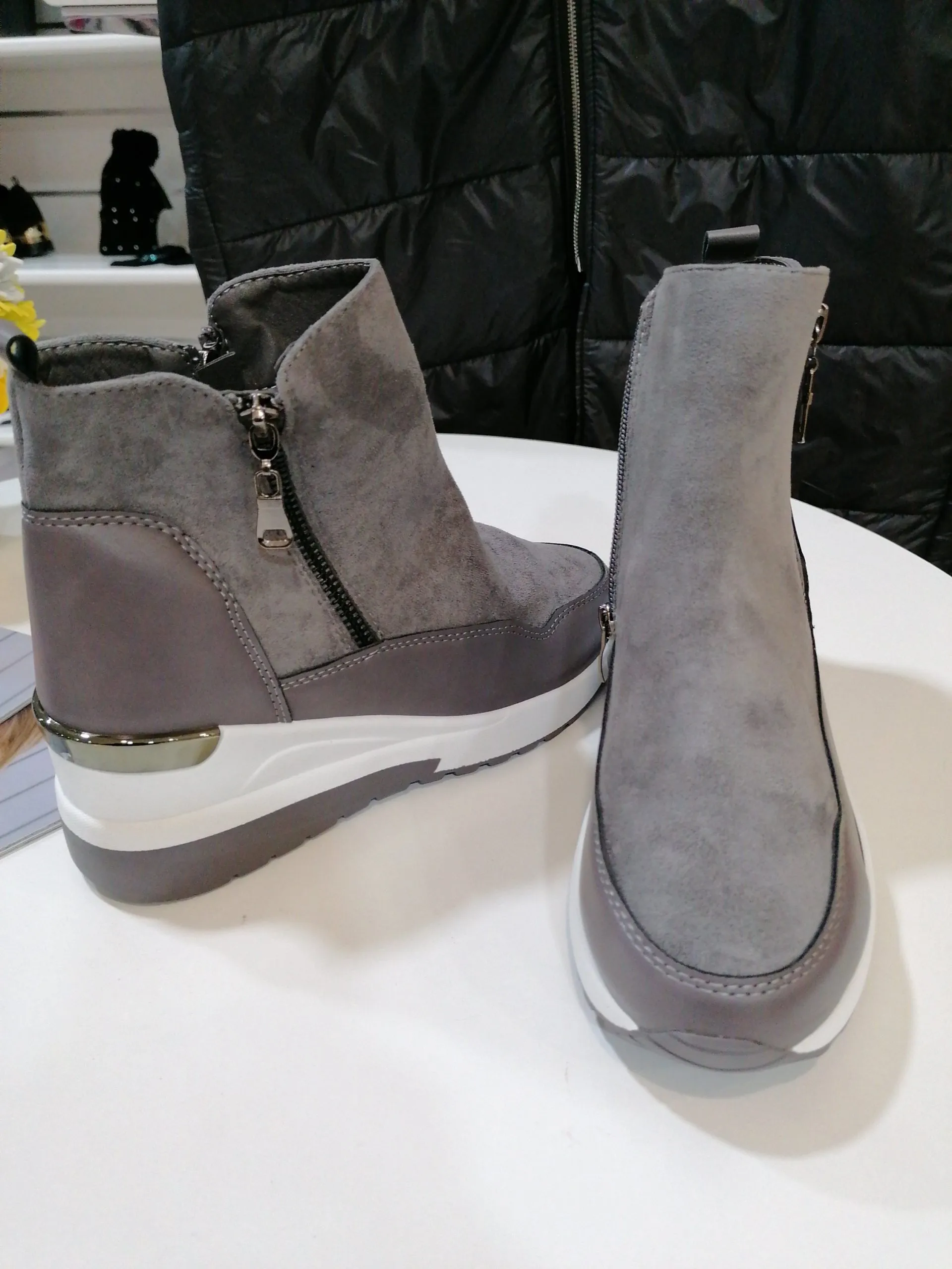 Sneakers donna, in camoscio, colore grigio scuro, modello collo alto, rialzo interno 7 cm. Con doppia cerniera laterale