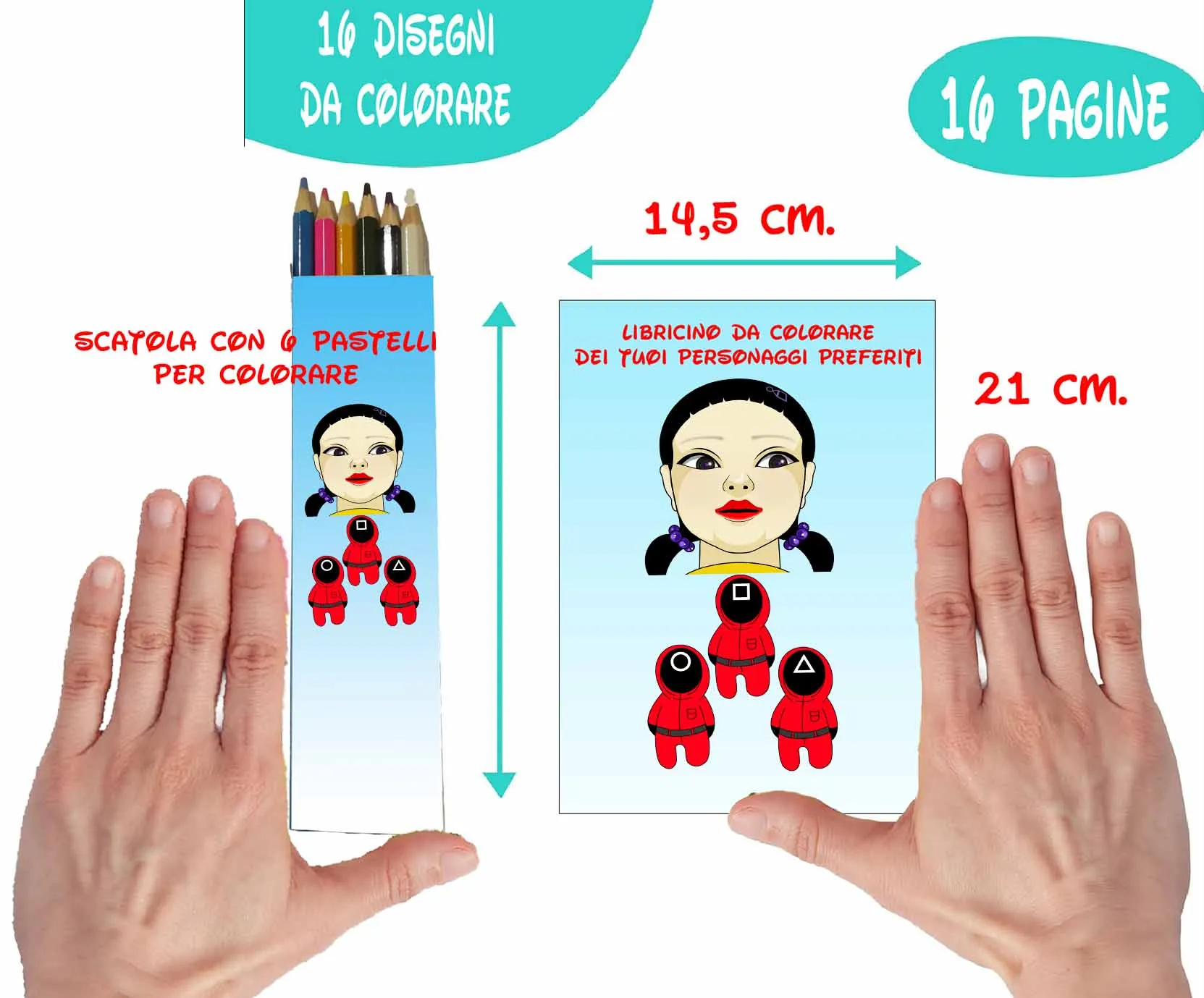 Squid and friends.Scatole da 6 Matite Colorate e libro da colorare con 16 immagini da colorare Kit da 1,3,5,oppure 10 confezioni