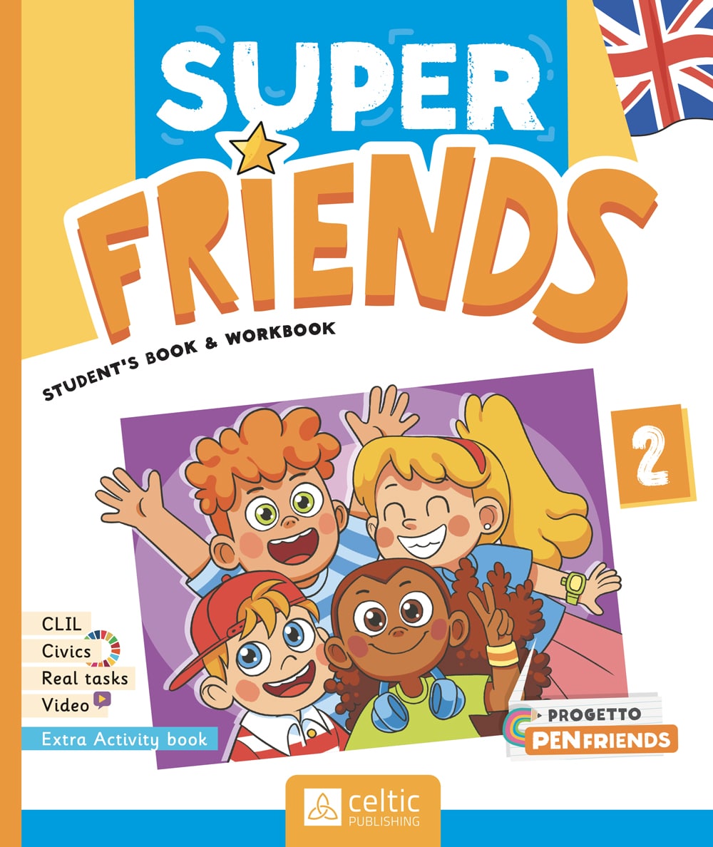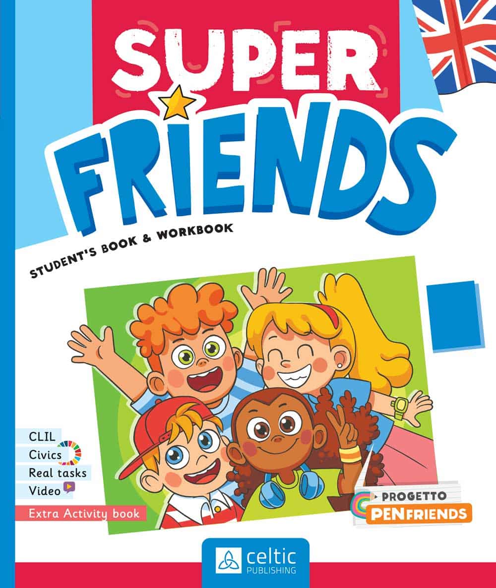 Filo conduttore del corso è l’amicizia, tema importante per la crescita emotiva e intellettiva di bambini e bambine: amicizia che nasce tra compagni di scuola e a distanza tra penfriends, gli amici di penna. È intorno all’amicizia e all’inclusione che vengono sviluppate storie dove i personaggi incontrano nuovi amici e conoscono nuove realtà. Nelle sezioni ‘You and Me Super Friends’ di ogni unità vengono praticare le strutture e il lessico appresi applicandoli al registro epistolare, imparando così a scrivere lettere da inviare agli amici che usano lo stesso testo e a fare rete tra classi con progetti da condividere. Per questo, a disposizione della classe, la Letter box e una pagina fb dedicata alle docenti: un’utile bacheca di scambio opinioni e indirizzi per intraprendere la corrispondenza tra bambini di scuole diverse. Particolare enfasi viene dunque posta sull’inclusione e sui valori che portano a una positiva convivenza civile quali l’accettazione di sé e dell’altro e la condivisione (Social Emotional Learning), temi trattati anche nella sezione Civics, dedicata all’Educazione Civica e presente in tutti e 5 i volumi. Inoltre, nel libro di testo, le attività sulle 4 abilità, le canzoni, i giochi linguistici, gli approfondimenti culturali e grammaticali rendono il testo completo, dinamico e motivante. In classe quarta e quinta, anche pagine dedicate alla preparazione della prova INVALSI, con esercizi mirati per prendere confidenza con i test e prepararsi in maniera graduale alla prova.