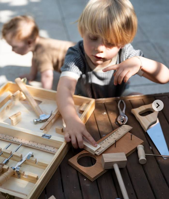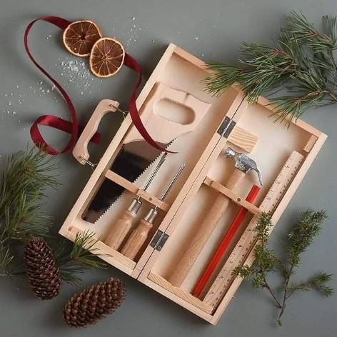 Il sapore dei giochi di una volta, in questa valigetta attrezzi in legno: il bello del bricolage per piccoli amanti del fai da te. Tutto il mondo del fai da te, per fare come i grandi, costruire mondi e raccontare storie. La versione piccola contiene 6 attrezzi veri come una sega, un martello, un righello e una matita, cacciaviti.., quella grande 14 utensili veri, tra cui una sega, un martello, uno scalpello, una livella, un righello e una matita, cacciaviti…