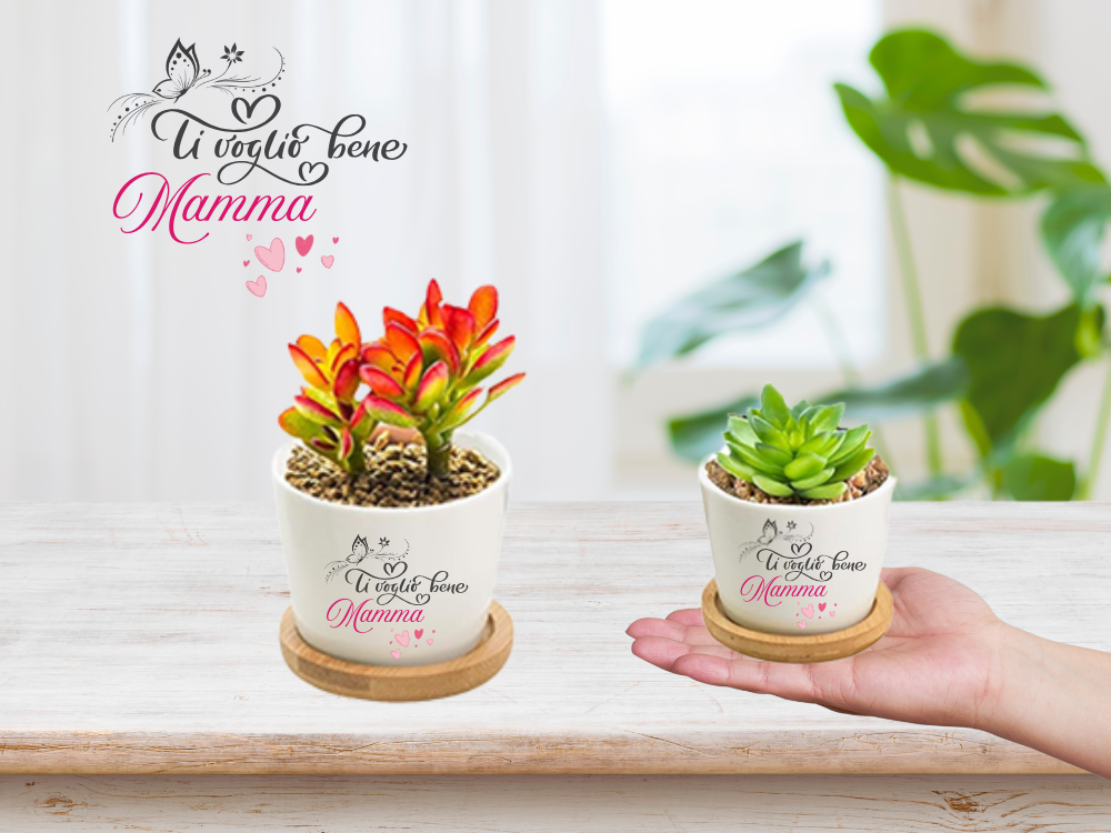Vasetto in ceramica bianca con dedica per la mamma. Un piccolo pensiero pieno di amore: una piantina grassa, simbolo di forza e tenerezza, per celebrare la mamma che fa fiorire ogni giorno la nostra vita. Misura del vasetto 6,5 cm x 5 cm