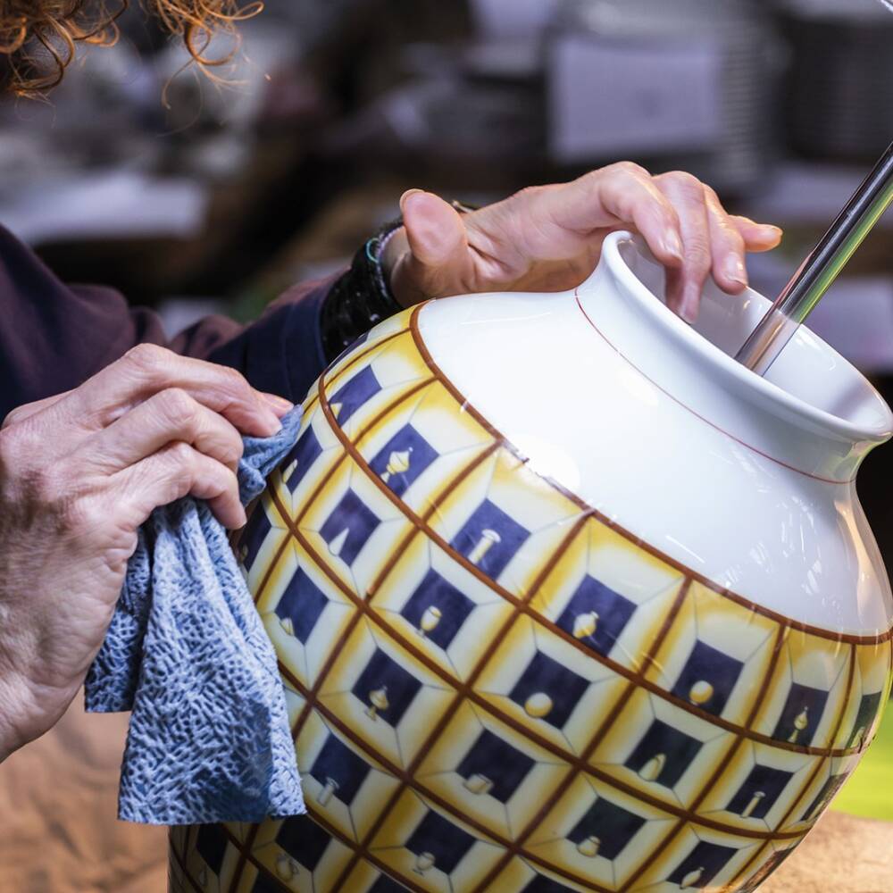 Questo vaso è una delle opere più note di Gio Ponti e rivela la sua formazione di architetto nel titolo, nella serie di vasetti che occupano le celle e nella resa prospettica delle celle stesse, che preludono la visione da un unico punto di vista. L’esemplare qui presentato ha dimensioni ridotte rispetto a quello ideato da Ponti, la cui forma con i riquadri a rilievi fu eseguita a partire dal 1923, mentre questo tipo di decoro è datato 1925. Richard Ginori presenta questo vaso in porcellana con l’effetto illusionistico del rilievo e con il decoro studiato in decalcomania. Le conoscenze dei maestri e dei tecnici della Manifattura hanno permesso di evocare un’opera di Ponti avvalendosi delle moderne tecnologie, come lo stesso Ponti aveva auspicato proponendo, per alcune sue creazioni, l’intervento di varie tipologie di decoro. In questo caso, la Manifattura ha tradotto in una visione lineare il decoro, studiando l’aderenza dello stesso a una superficie con forte rastrematura verso l’alto e verso il basso. Decorato a mano, in decalcomania, viene impiegata la tecnica del ‘taglio in doppio’ al fine di mantenere il medesimo spessore dell’incorniciatura delle celle.